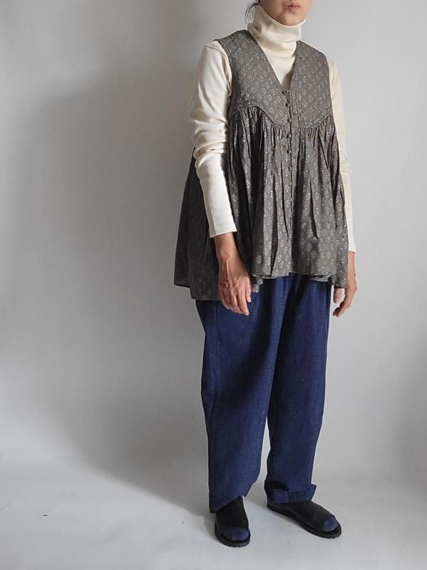 maison de soil(メゾンドソイル)Vネックノースリーブシャツ 80s COTTON VOILE FLOWER BLOCK PRINT RAJASTHAN TUCK GATHERED