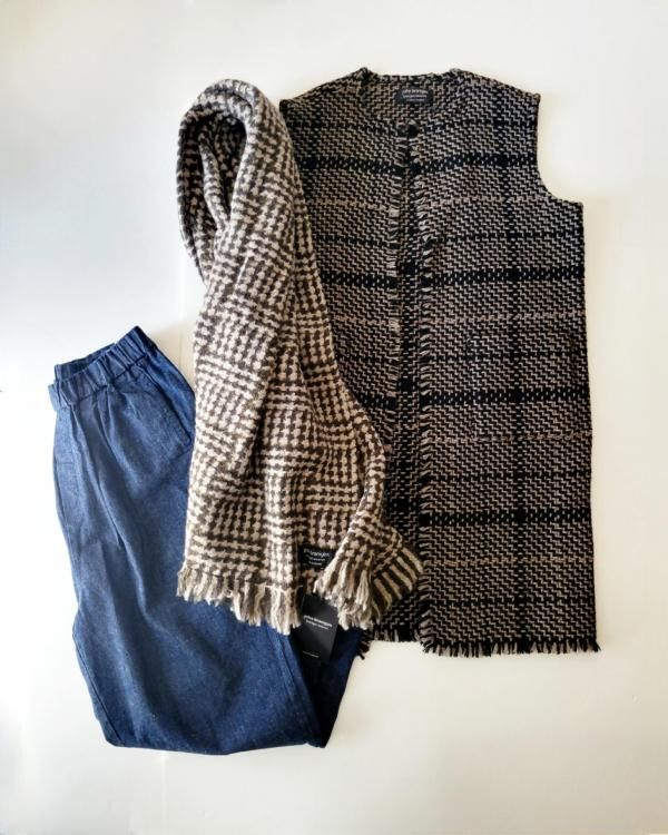 シンプルな一枚仕立てながら保温性にも優れたジレストールは、季節の変わり目のレイヤードスタイルにぴったり。